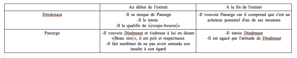 Activité : Décrivez l’attitude de Dindenaut et de Panurge en remplissant le tableau suivant. Observez la manière dont ils s’adressent l’un à l’autre.