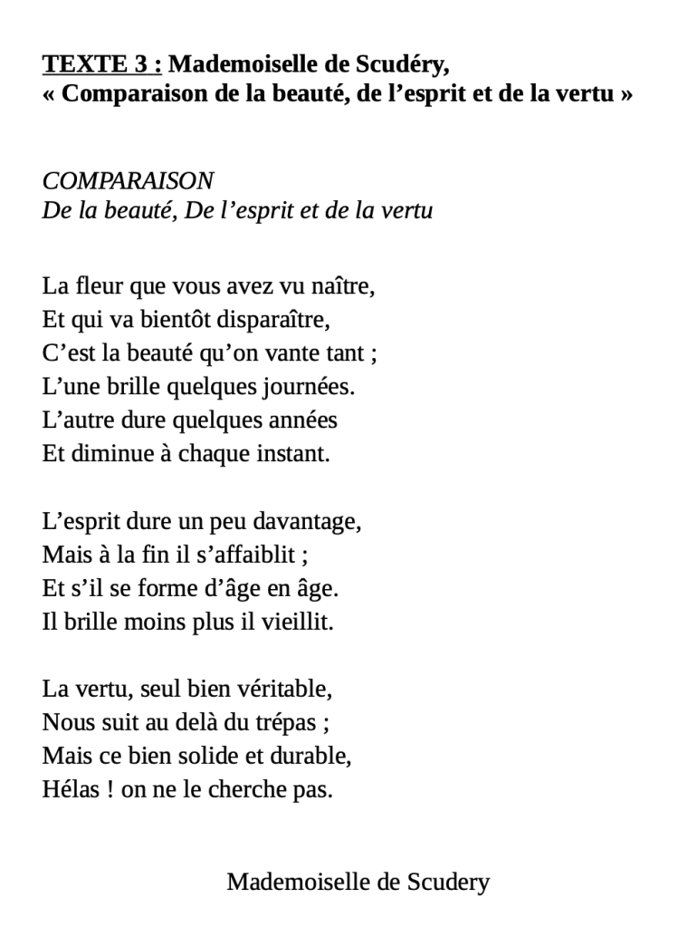 Dans ce poème, Madeleine de Scudéry évoque le caractère éphémère de la beauté et même de l’intelligence. Elle suggère que seule la vertu (=la bonté) traverse le temps sans faiblir et regrette que les hommes ne la choisissent pas. Pour imager son propos, elle utilise une métaphore, en associant la beauté à la fleur qui fane irrémédiablement.