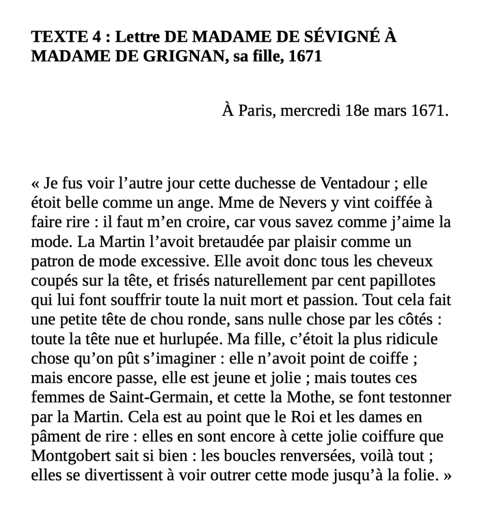Madame Sévigné s’adresse à sa fille dans cette lettre datée du 18 mars 1671. Elle lui décrit les coiffures ridicules des femmes de la cour, coiffées par une certaine Madame Martin.