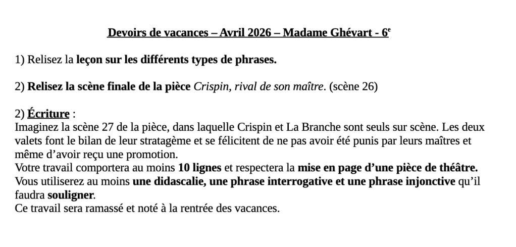 Devoirs de vacances Avril Partager : Partager sur X(ouvre dans une nouvelle fenêtre) X Partager sur Facebook(ouvre dans une nouvelle fenêtre) Facebook J’aime chargement…